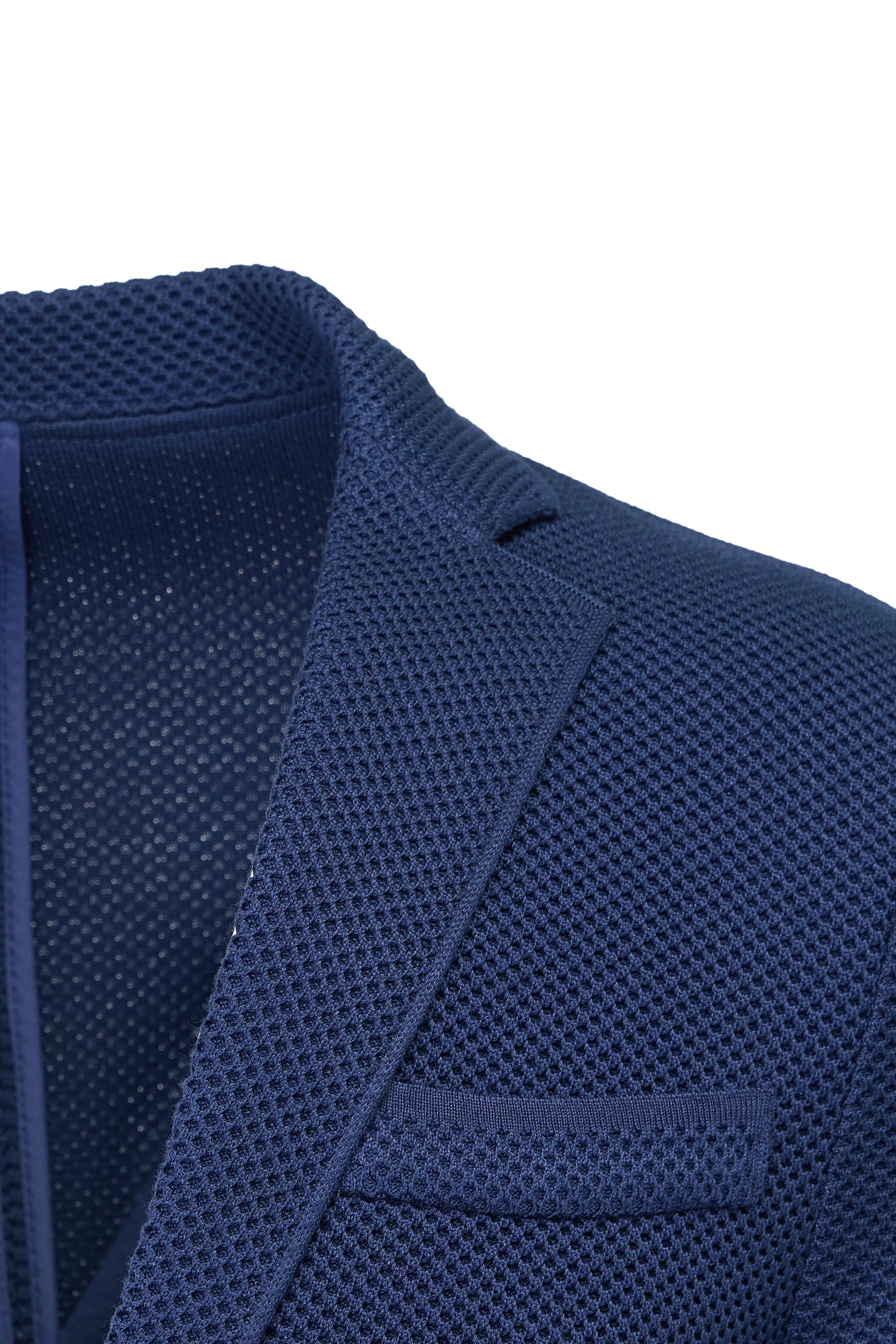 Our Navy Alba Knit Jacket is a 2 button jacquard knitted laser cut jacket, soft touch dobby finishing.